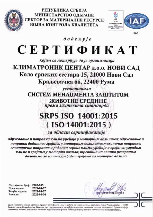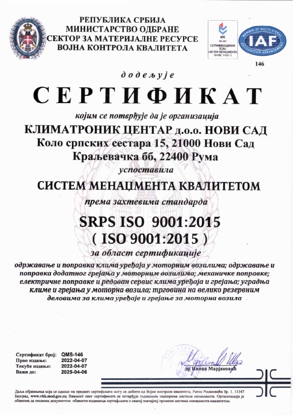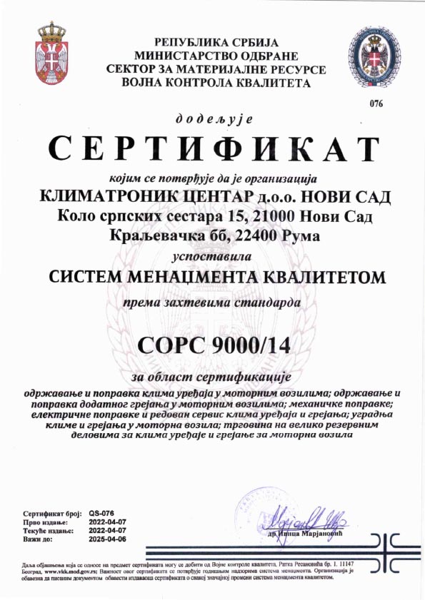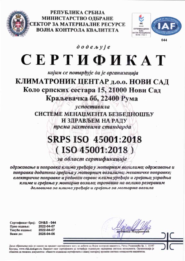 The company KLIMATRONIK CENTAR is committed to continuous improvement of the quality of services provided, and in accordance with that, it has fulfilled the conditions for obtaining a certificate in the QUALITY MANAGEMENT SYSTEM, OCCUPATIONAL SAFETY MANAGEMENT SYSTEM and OCCUPATIONAL SAFETY MANAGEMENT SYSTEM
